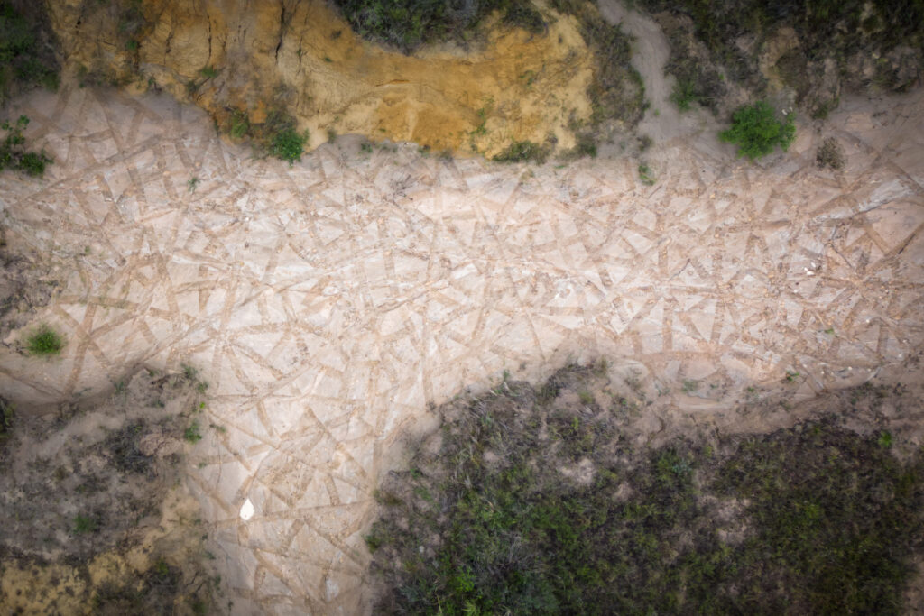 Unseen Weavings is situated in a sandy area on the shore of the Parana River. The artwork itself is a drawing on the sand, which is ephemeral in nature and will eventually be erased by the forces of wind and water. However, even after the physical drawing disappears, the act of creating it remains, revealing the intrinsic relationship between the elements of the surrounding environment.